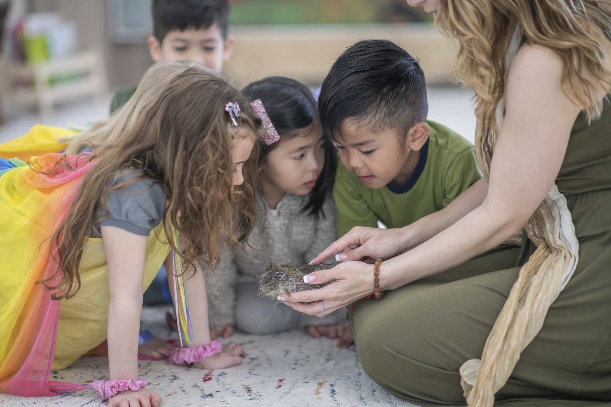 A teacher in her early 30s wearing a long green dress sits on the classroom carpet and shows her elementary students a bird’s nest which she is holding in her hand. The kids look on with fascination.